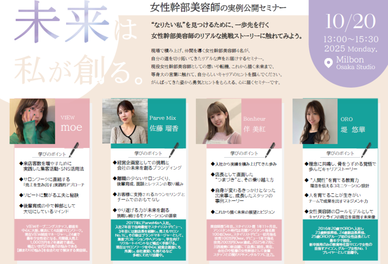 “なりたい私”を見つけるために、一歩先を行く 女性幹部美容師のリアルな挑戦ストーリーに触れてみよう。 現場で積み上げ、仲間を導く女性幹部美容師4名が、 自分の道を切り拓いてきたリアルな声をお届けするセミナー。 現役女性幹部美容師としての想いや転機、これから描く未来まで、 等身大の言葉に触れて、自分らしいキャリアのヒントを掴んでください。 がんばってきた姿から勇気とヒントをもらえる、心に届くセミナーです。