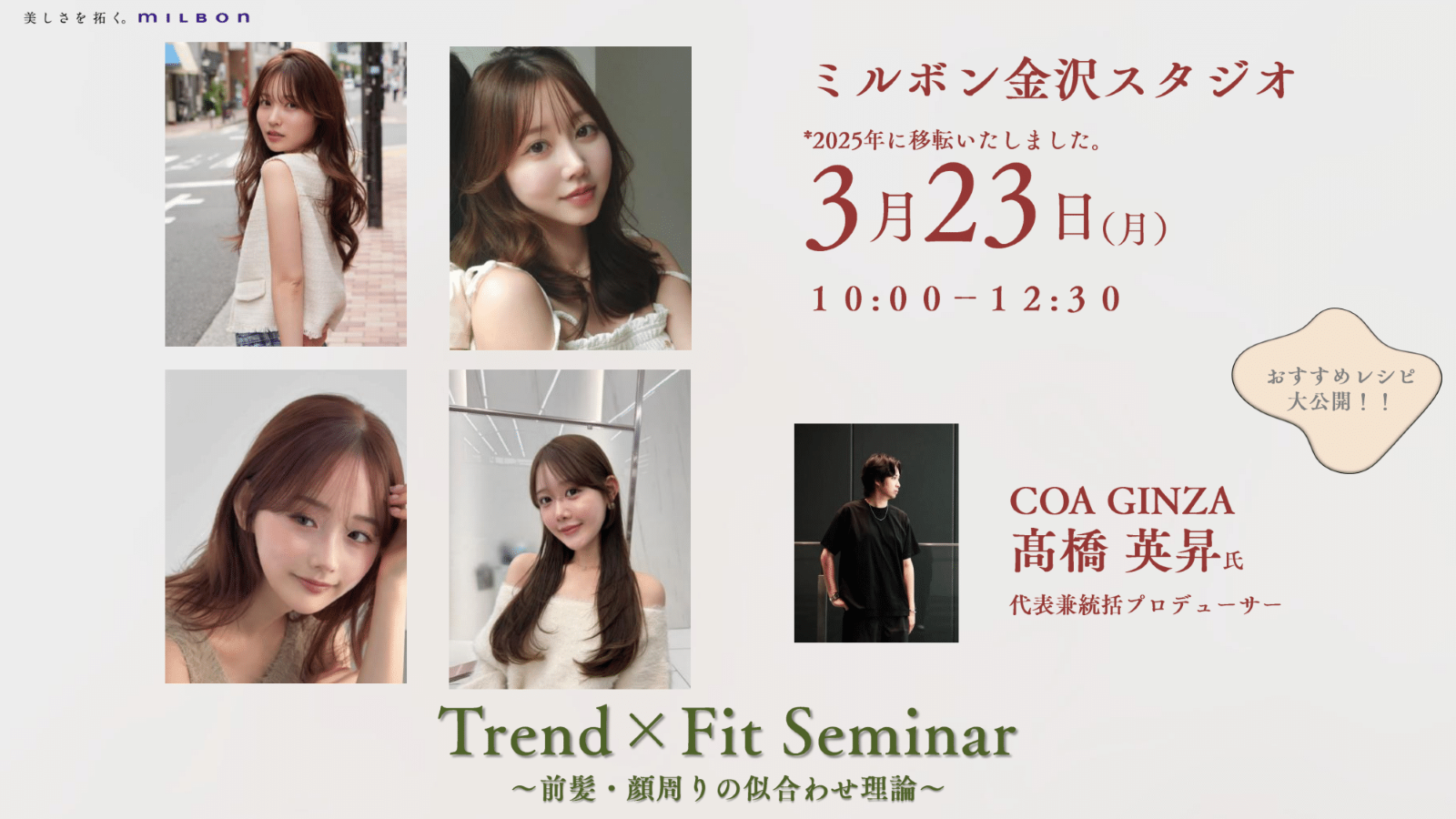 ●高橋氏が考えるトレンドニーズとは? ・フォローワー数10万人越え,トレンドの達人高橋氏がトレンド理論を徹底的に解説します! ● 必見!似合わせ・悩み解決ノウハウ解説 ・来店ごとにアップデートされる高橋流カウンセリングによる 一人一人に合わせた「似合わせ前髪×小顔見せ顔周りカット」を展示! ●トレンド×似合わせを叶える圧倒的艶カラー ・高橋氏独自の【透明感・艶・くすみ感】カラーを実現するための秘訣は素材見極め・毛髪診断!!高橋氏おすすめレシピも大公開です!
