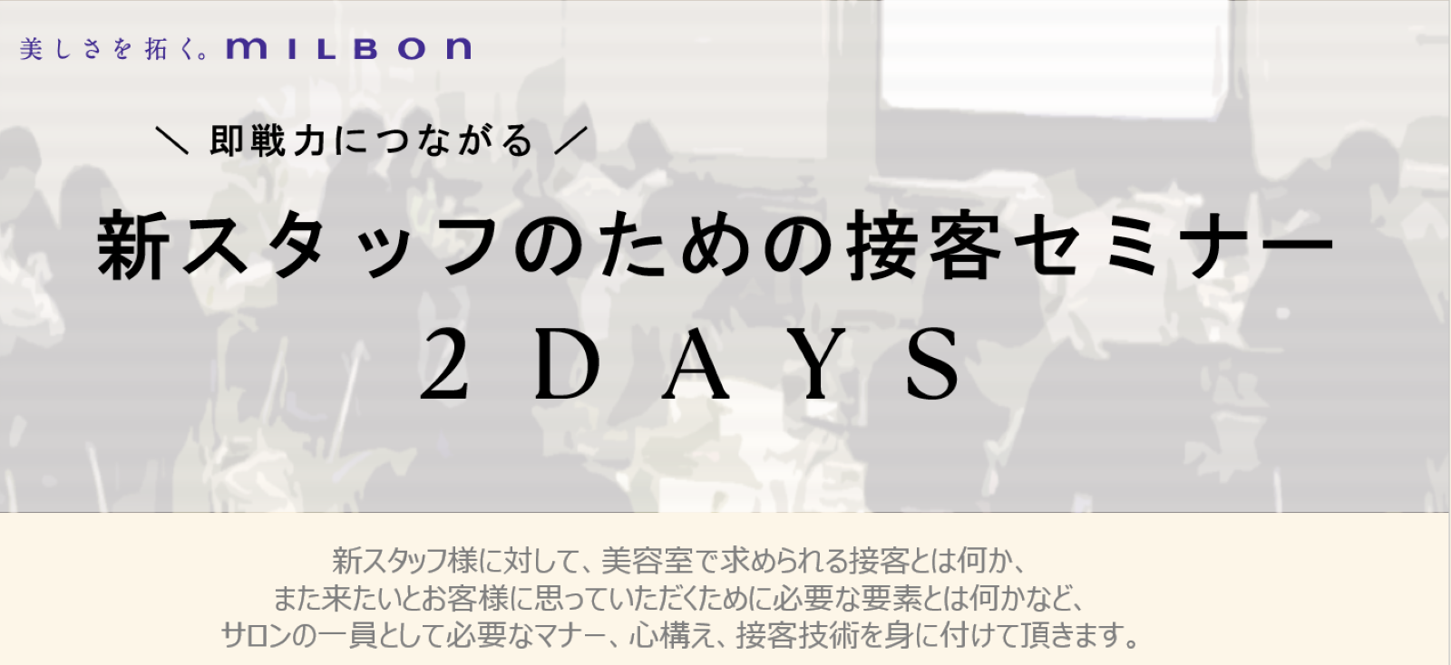 新スタッフ様に対して、美容室で求められる接客とはなにか、また来たいとお客様に思っていただくために必要な要素とはなにかなど、サロンの一員として必要なマナー、心構え、接客技術を体得いただくセミナー。