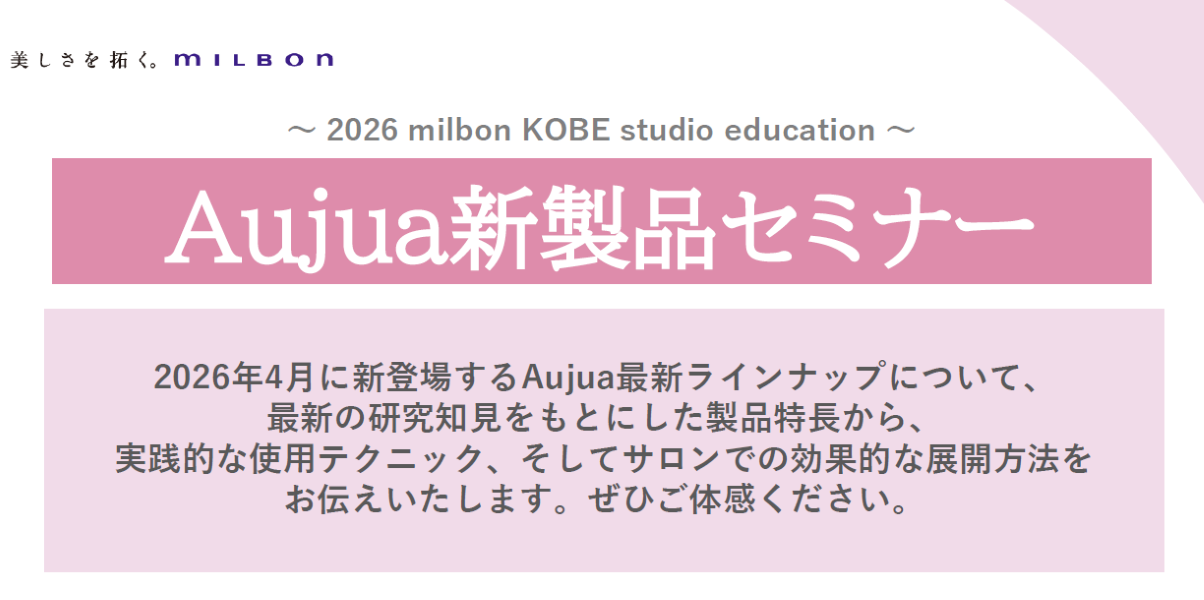 2026年4月に新登場するAujua最新ラインナップについて、 最新の研究知見をもとにした製品特長から、 実践的な使用テクニック、そしてサロンでの効果的な展開方法まで、 余すことなくお伝えいたします。ぜひご体感ください。