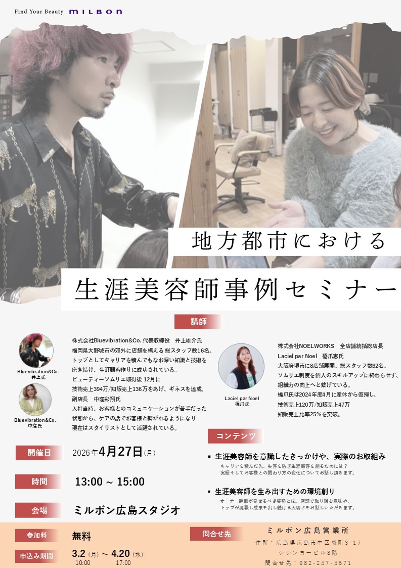 地方都市において生涯美容師として活躍されているBlue vibration井上氏とLaciel par Noel橋爪氏。 キャリアを積んだ上での「お任せオーダーの顧客」の自然失客を防ぎ、お客様とのさらに深い関係の構築にチャレンジし成果を出されている美容師さまの実例を発信します。