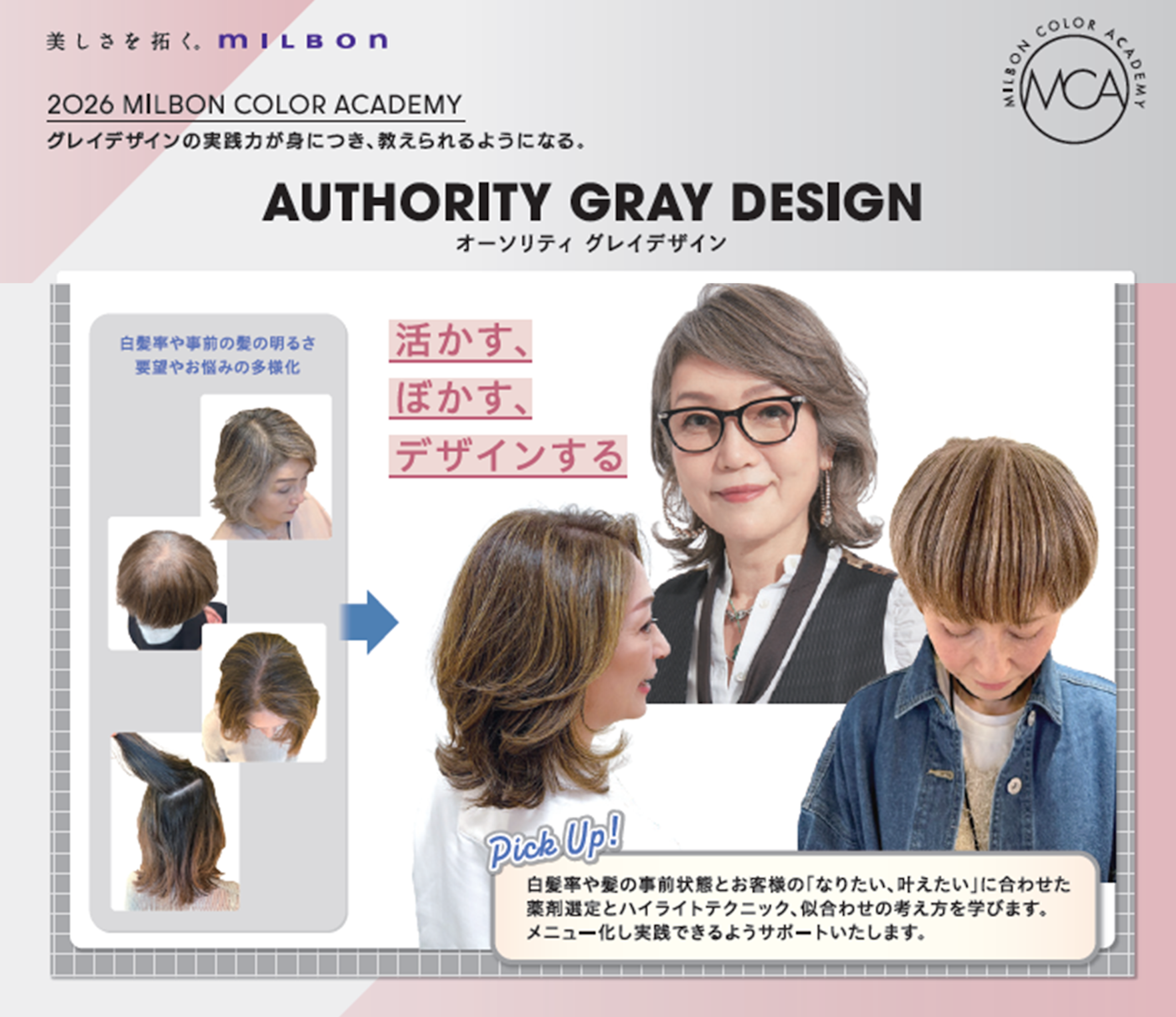 大人女性の多様化したニーズにトータルで対応できるスキルを習得するグレイヘアカラーアカデミー。 トップスタイリスト~サロン内教育者を対象に、グレイ素材のデザインバリエーション(活かす、ぼかす、デザインする)をモデル実習込みの4日間で学習し、顧客満足度を高めます。。